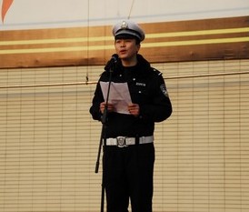 主持人:感谢田汉同学与大家分享他的想法。的确,遵守交通规则非常重要,尤其作为一名高品德、高素质的南外人,更应将其铭记在心。每年都有成千上百起事故仅仅因为人们心中没有正确的交通安全意识所致。那么我们在日常生活中应该注意些什么呢?宋警官在几年的警察生涯中感触颇多,下面有请宋警官为我们作答。