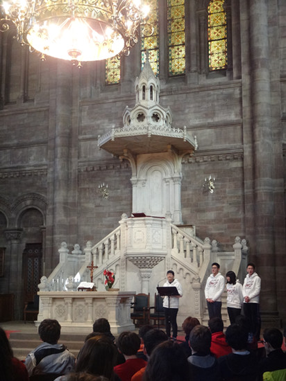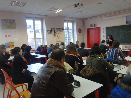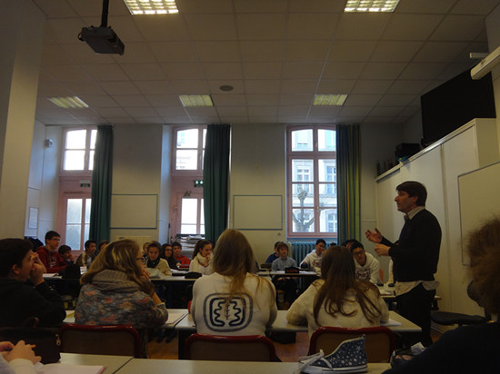 1月27日下午,365官网青奥同心结4位文化交流代表在周弋校长、团委尹荷蓉书记和叶军老师的带领下抵达位于斯特拉斯堡的让·斯特拉姆学校,受到该校师生的热烈欢迎。随后,365官网师生走进法国学生的课堂,正式展开文化交流活动。