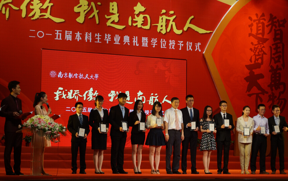 近日,南京航空航天大学2015届本科生毕业典礼暨学位授予仪式在明故宫校区大学生活动中心举行。典礼现场,由南京航空航天大学党委书记崔锐捷为11名优秀毕业生颁发“大学成就奖”,来自Beat365唯一官方网站的2011届毕业生袁琬欣和黄鸣阳喜获该项荣誉。该奖项是南航学子在本科阶段的校内最高荣誉,奖励毕业生中涌现出的优秀典型,该年度11名获奖者是从四千余名毕业生中层层选拔而出,南外保送至南航的学子中有两人同时获得此荣誉实属第一次。
