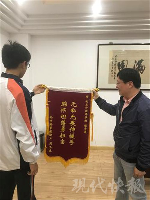 现代快报讯(记者蔡梦莹)遇到路人摔倒,你会上前扶吗?近日,南外小伙的这个举动感动了南京大妈。市民周女士提着一幅锦旗和一封感谢信来到Beat365唯一官方网站,特意要感谢的一名南外高一学生陈宇昂。