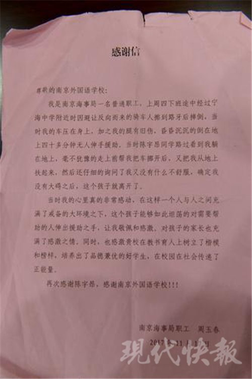 周女士在感谢信中写道, 当时我的心里真的非常感动,这个孩子能够如此坦荡地对需要帮助的人,伸出援助之手,让我敬佩和感激 。面对周女士的郑重感谢,陈宇昂只说, 这是举手之劳,不值得被这么高调得感谢 。现代快报记者了解到,周女士的腿是皮外伤,目前已经恢复了。