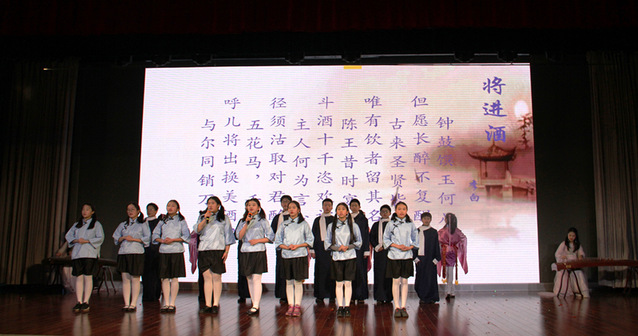 伴随着古筝琴声,7班同学们慷慨激昂地朗诵了古诗《将进酒》,再现了诗仙李白的文字魅力和豪情万丈。