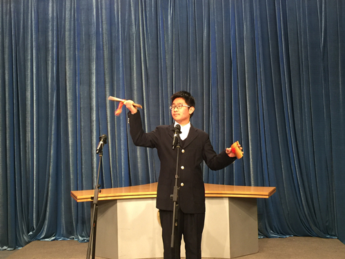 肖潇:如果仅是为了漂亮的分数或是逃避一时的难堪而在自己的回忆中留下苦涩的一笔,岂不可惜?高一(6)班的杨宇轩同学有话要说,请听快板《诚信考试,从我做起》