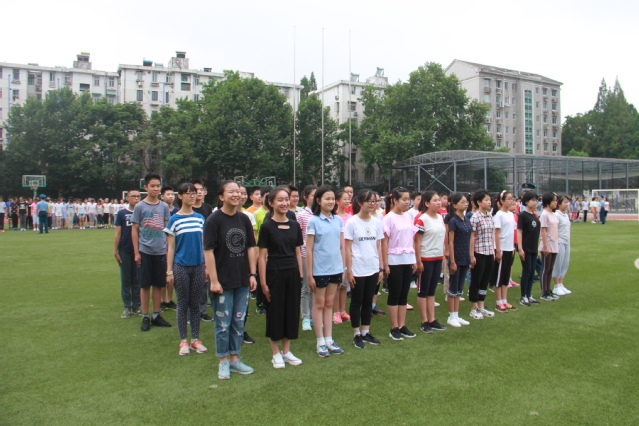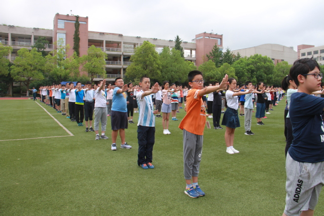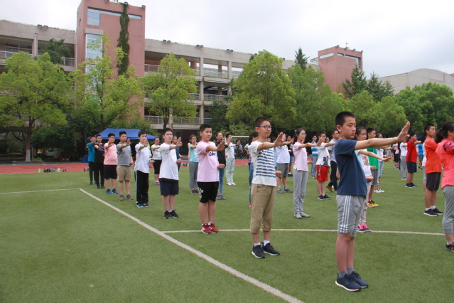 初一入学教育进入第二天,炎炎烈日并没有阻挡同学们前进的脚步。首先进行紧急集合,各班迅速按照紧急疏散路线到操场集中,并清点人数。健功拳练习时,阳光洒在同学们身上,汗水迅速湿透衣服,但同学们一招一式,一拳一掌依旧能做到准确到位。