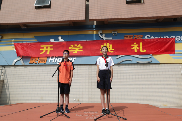 初一新生代表熊苏雅和韦十发言,分享了他们在南外新起点上对南外新生活的感受。