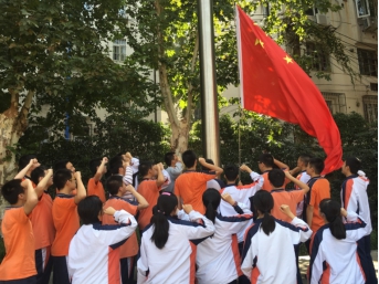 高二(4)班的同学在与国旗合影的环节中,感到身为中国人的民族自豪感和不可推脱的责任感。
