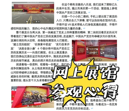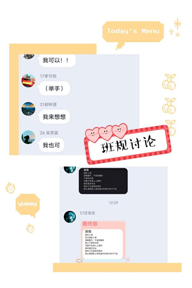 班规的讨论中大家也都表现得很积极主动,愿意为班集体做出贡献,争相提议。我们很快确定了线上学习点名、作业收集及上课纪律的方案。网上展馆的电子小报任务大家也迅速找到组织,讨论分工,俨然有序。