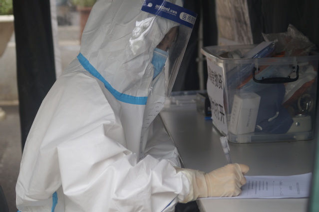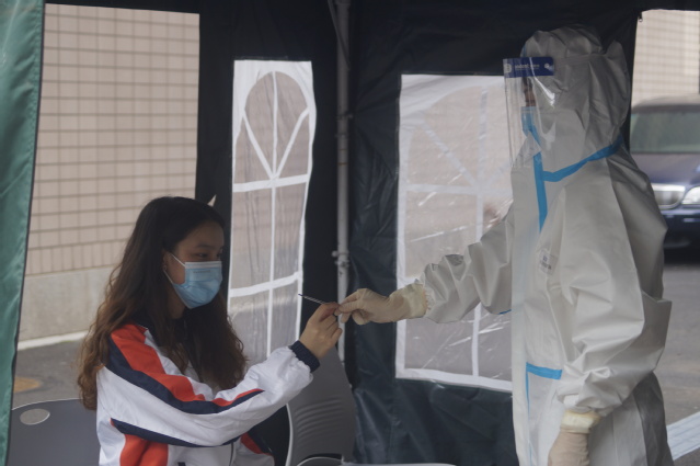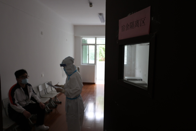 校医前往隔离区,对体温异常学生复测体温。