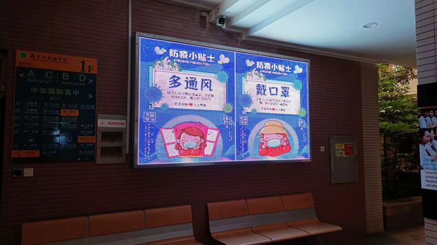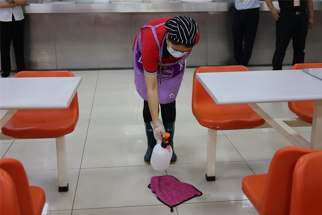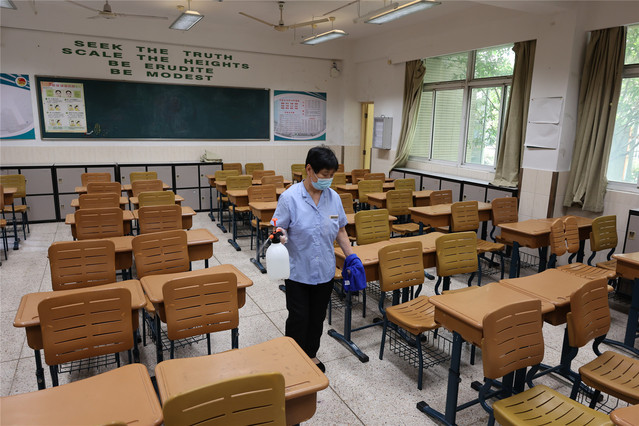 物管使用84消毒液喷洒拖地、紫外线灯照射、加强通风等措施对高一(1)班教室进行消杀。