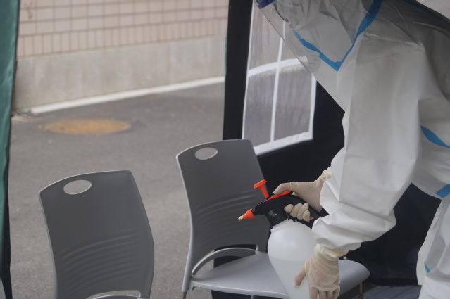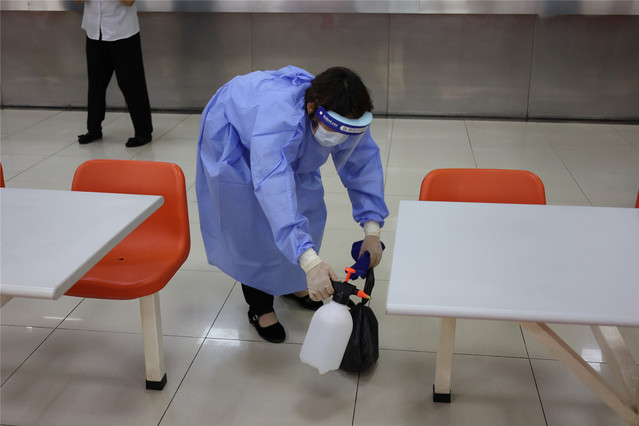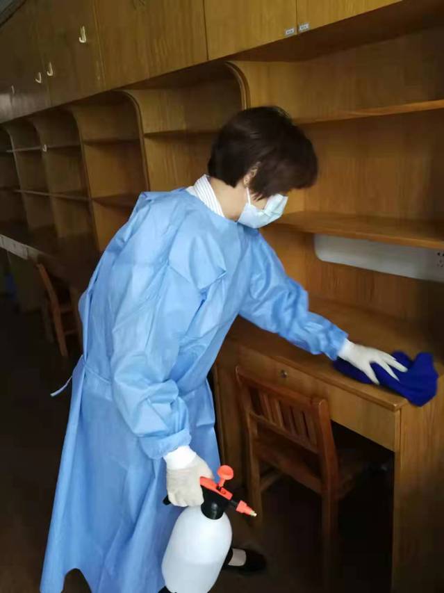 患病学生离开隔离区后,物业保洁人员立即用84消毒液喷洒、紫外线灯照射、通风等措施进行隔离区消杀处理。
