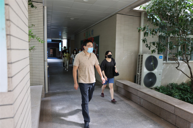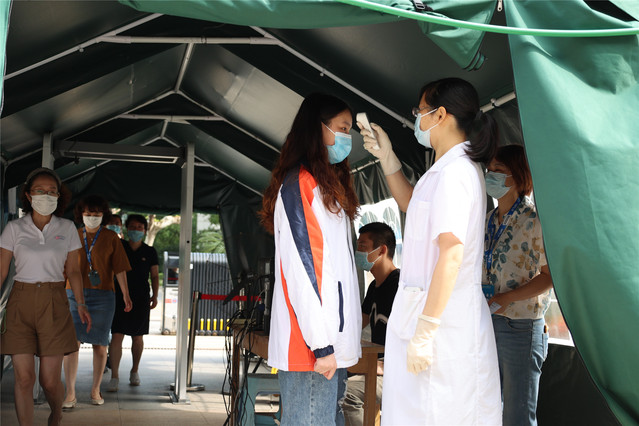 值班老师发现有一位学生体温异常,体温为37.5℃,立刻通知在校门口值班的校医,校医使用额温枪现场复测学生体温,复测两次均有升高,引导发热学生带至隔离区。