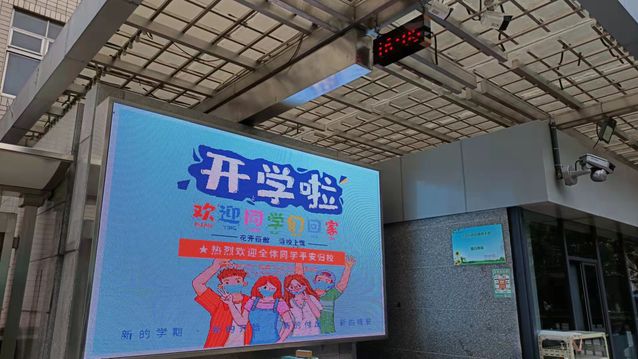 早晨进校时,学生按照间隔1米以上的距离排队有序经过红外测温区。值班老师使用测温设备对入校学生进行体温监测。
