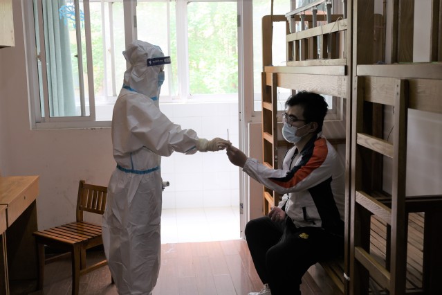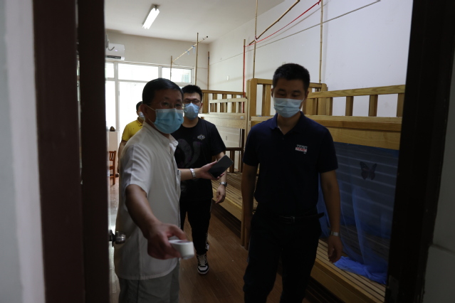 宿舍管理老师晚检时,使用额温枪监测学生体温,发现一名男生体温升高。