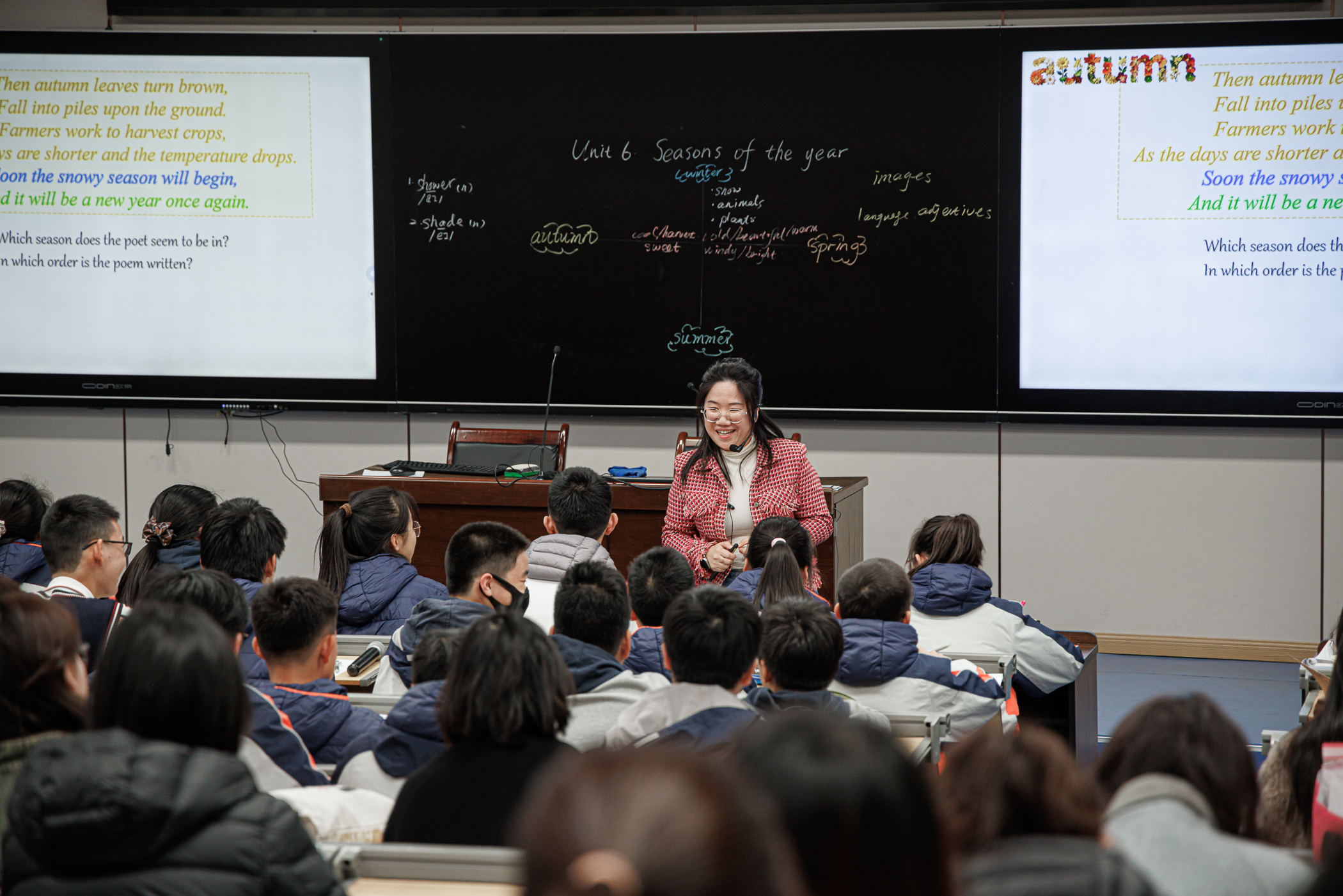卢雅睿老师执教的是译林版《英语》八年级上册第六单元阅读课。卢老师从一首关于秋季的小诗导入,让学生直观感受季节特征和诗歌体裁。在阅读环节,教师引导学生通过各种感官体会四季之美,设计感官图表帮助学生搭建支架,将抽象的概念转化为外化表达。最后在优美的音乐中,学生以小组的形式将心中最美的季节写成小诗,誊写在校园明信片上,展现了南京的季节之美。