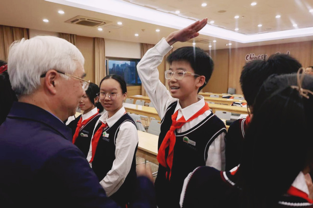 11月3日下午,阳光洒满南外校园,一场意义深远的主题活动在此举行。校24-25届、25-26届大队委、25-26届国旗班成员齐聚一堂,与市关工委领导、校领导共同迎接一位特殊的亲人的到来——64级校友秦志强先生。秦老师1964年进入南外初中法语班学习,1969年参军,曾任团政委,1994年转业。他不仅是孩子们的学长,更是红色精神的坚定传承者。