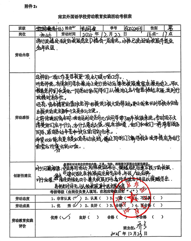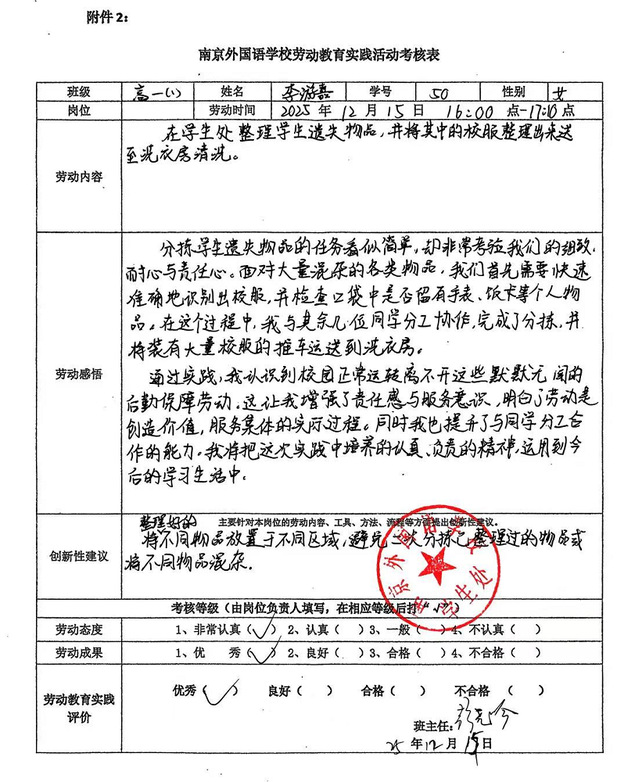 作为流程最规范的班级之一,同学们详细记录了“岗前培训—上岗劳动—总结反馈”的完整闭环。他们将此次活动视为一堂生动的“生活思政课”,在汗水中收获成长,在协作中感悟责任,并就工具配备和时间安排提出了建设性建议。