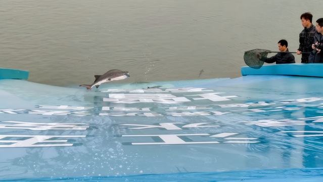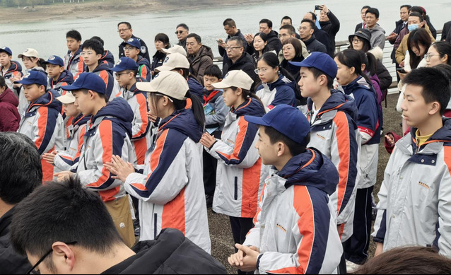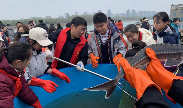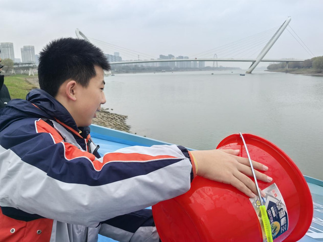 随着现场主办方领导宣布放流活动正式开始,同学们纷纷戴上手套,有序地走到放流点前,亲手将一尾尾珍贵的鱼苗送入长江。他们有的两三人组队,抬起数十斤重的成年中华鲟,送上放流台;有的小心翼翼托起幼年中华鲟鱼苗,轻缓倾入江水;有的双手拎起一桶胭脂鱼苗,缓步走向放流点放流。江风拂过稚嫩面庞,水花溅湿校服袖口,却无人擦拭,目光追随着鱼儿游向长江深处。在他们小小的身影中看到了生态保护大大的希望。